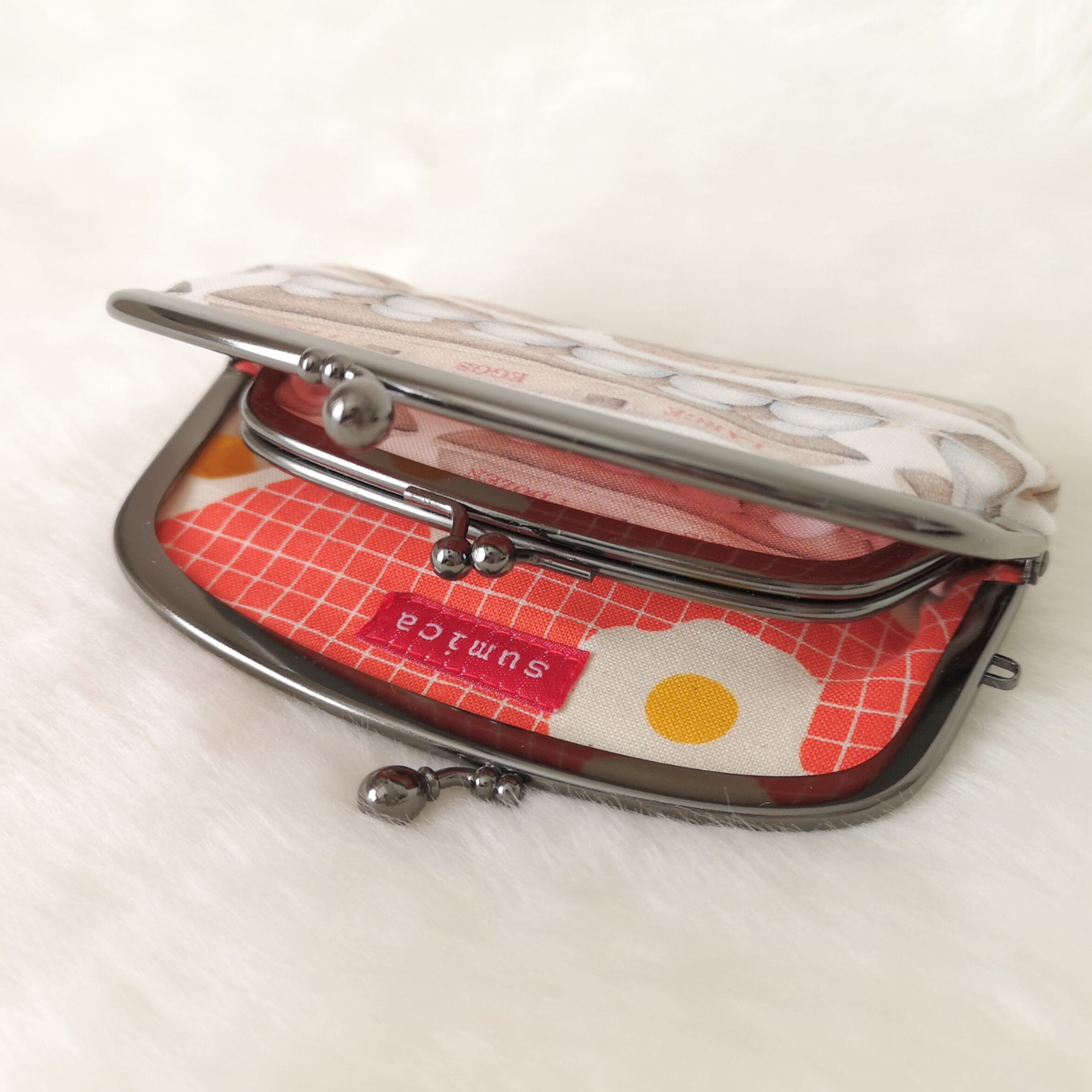 個性的なたまごパックの柄にオレンジ色の目玉焼き柄をあわせたユニークなお財布です。