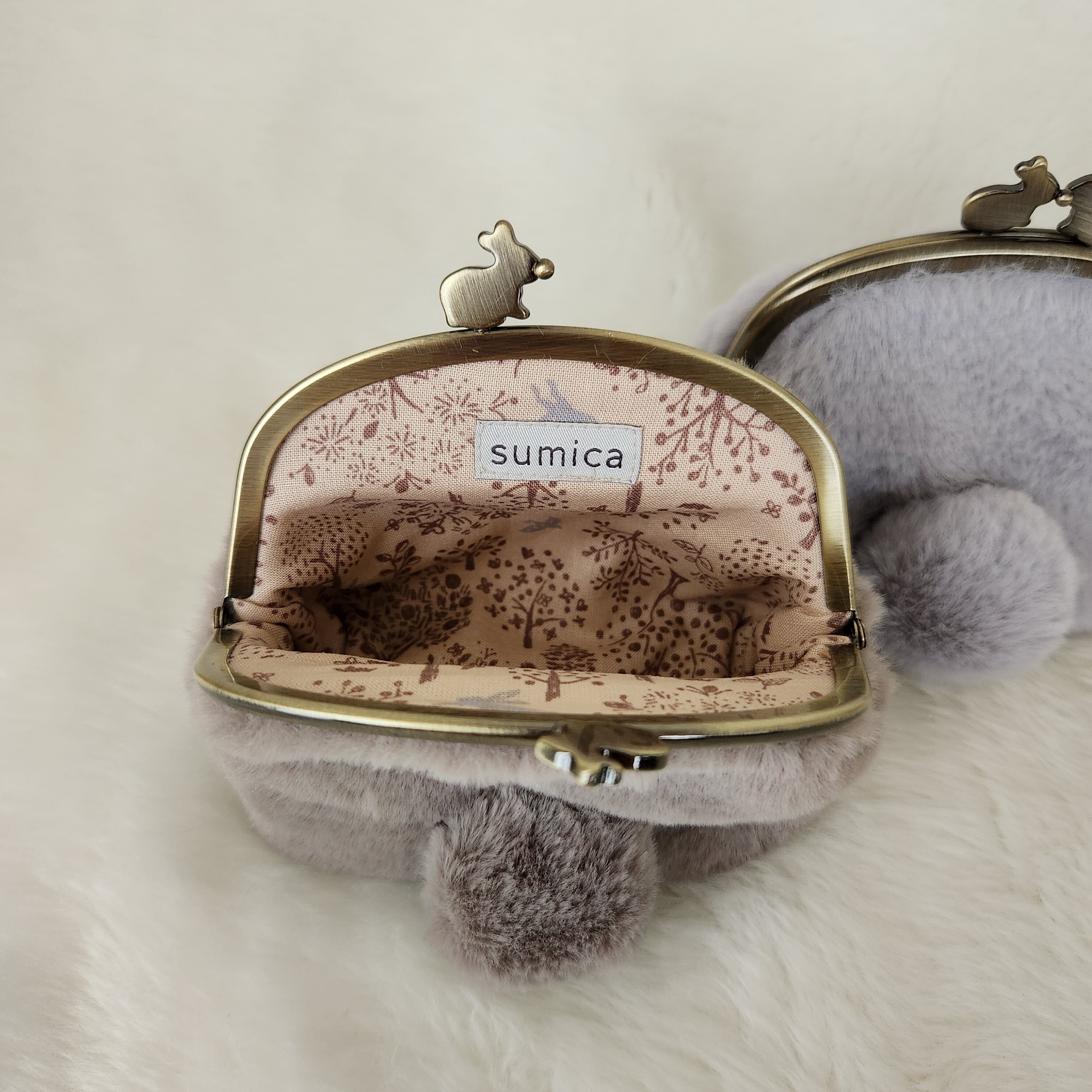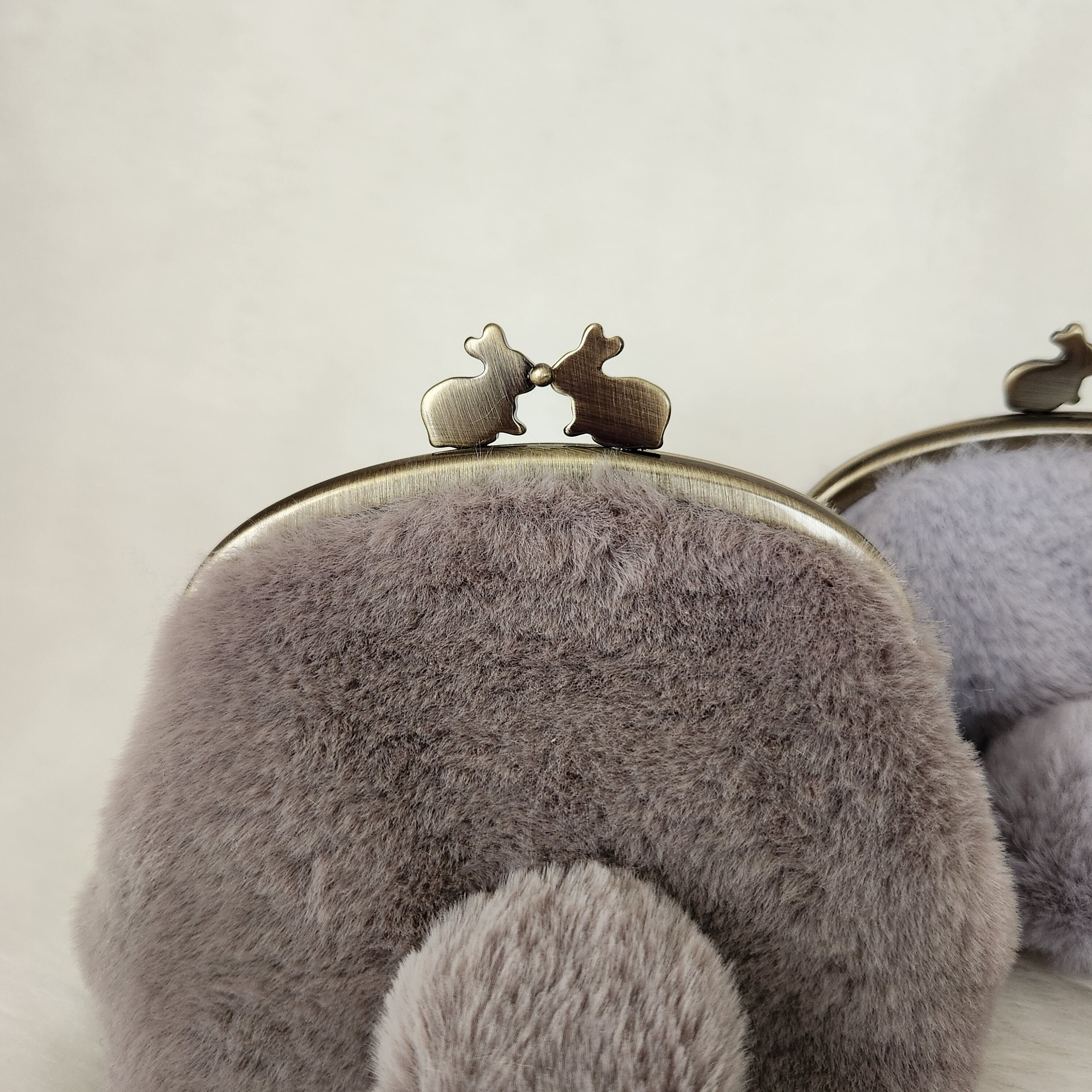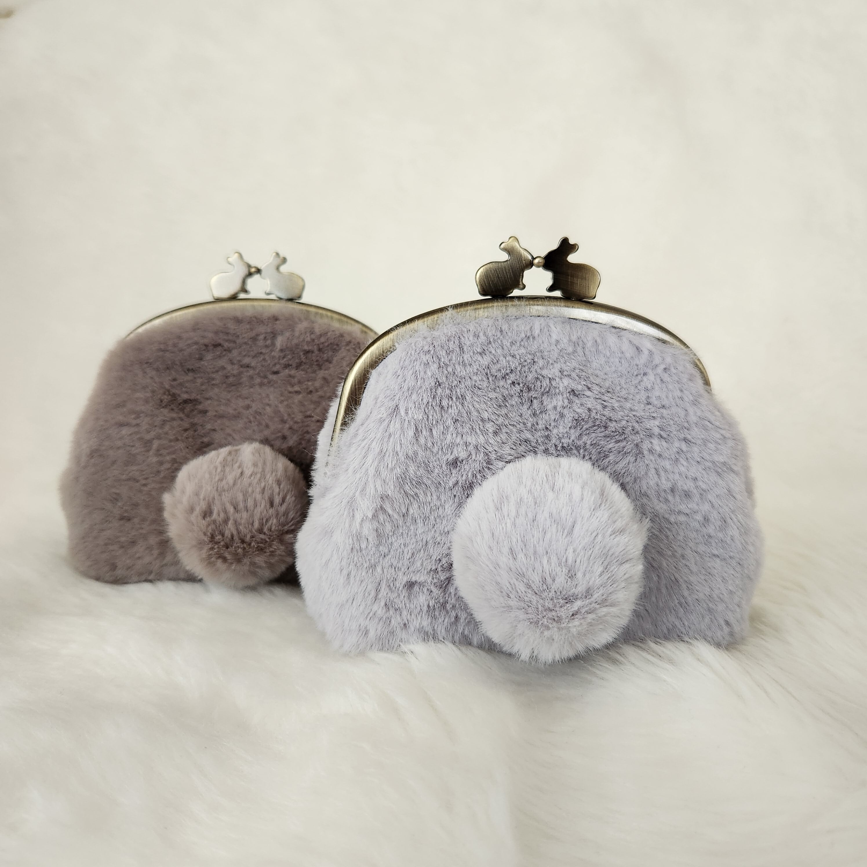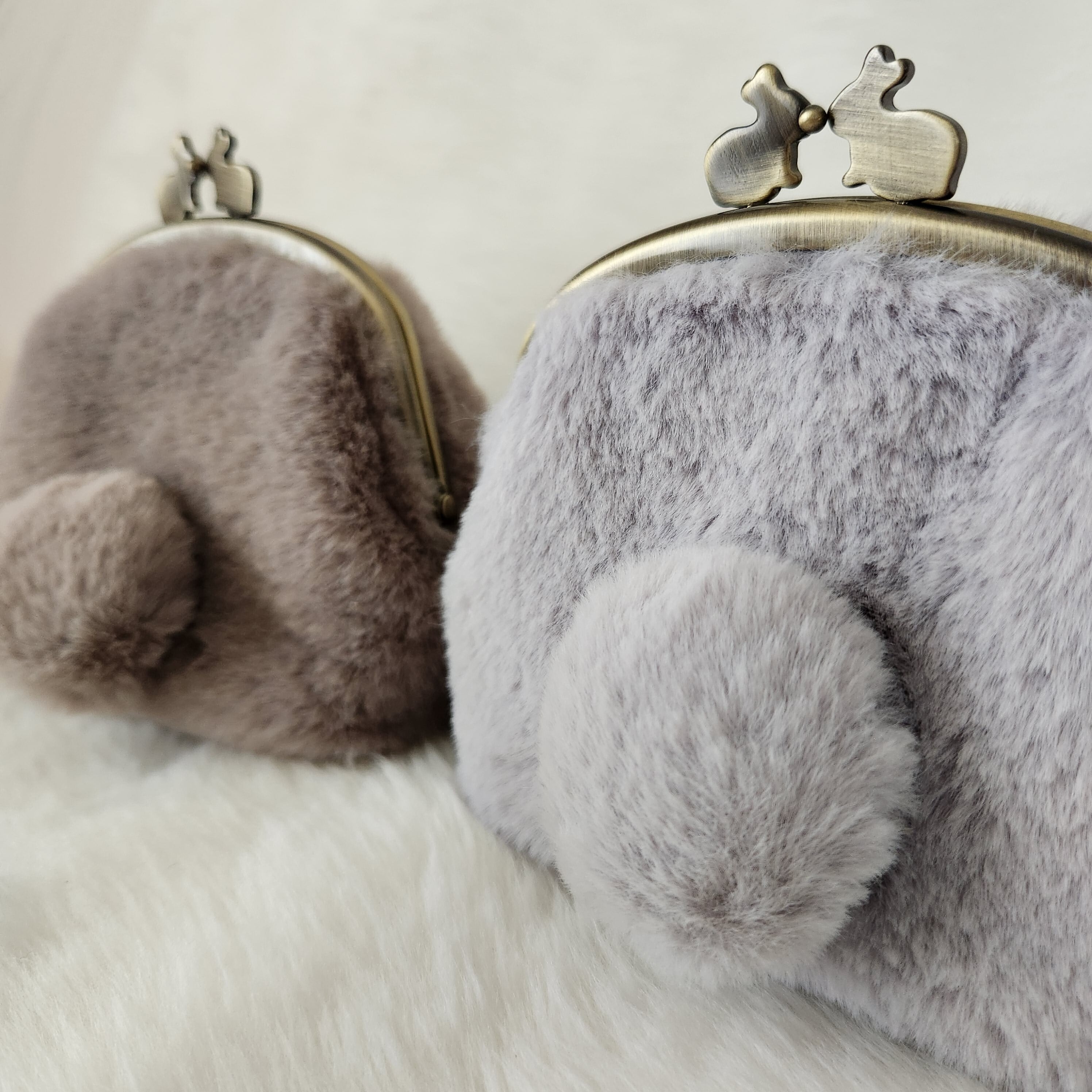 うさぎのおしりをモチーフにした、フェイクファー(ラビットファー)のがま口ポーチです。
